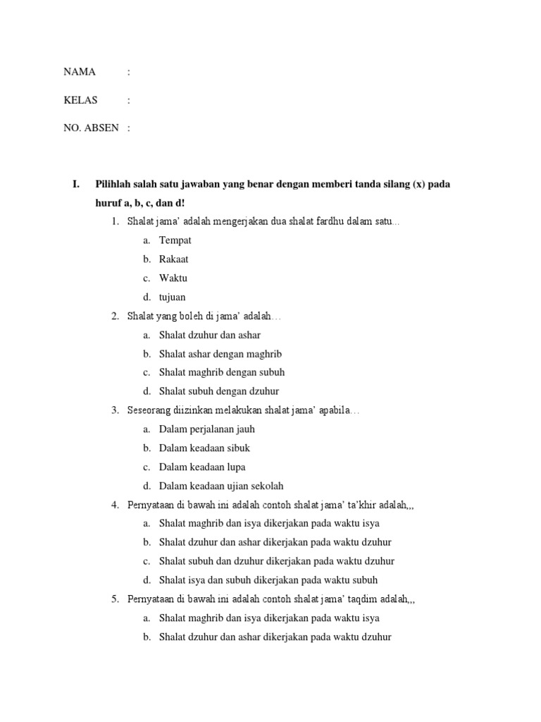 Soal penilaian harian pai online shalat jama' dan qashar. Salat yang boleh di jama' adalah. Jama' taqdim penggabungan pelaksanaan dua salat dalam. Seseorang diizinkan melakukan salat jama' apabila. Menjamak karena sesuatu keperluan dan halangan. Dalam keadaan sibuk kunci jawaban b. Mereka berhenti di masjid untuk istirahat dan melakukan salat. Barangsiapa yang mensyaratkan tambahan bilangan yang ada pada shalat berjama'ah, maka ia harus menunjukkan dalil pendapatnya itu. Dengan demikian apabila seseorang bertujuan menjama' shalat secara jama' ta'khir yang disebabkan alasan adanya hujan, kemudian hujan itu berakhir sebelum tiba waktunya shalat yang kedua, berarti sebab rukhsah telah hilang dan sebagai akibatnya ialah telah melakukan shalat diluar waktunya. The document has been permanently moved to here. Salat yang dilakukan oleh rosyid adalah salat … Salat qasar merupakan keringanan yang diberikan kepada mereka yang sedang melakukan perjalanan ().adapun salat yang dapat diqasar adalah salat zuhur, asar dan isya, di mana rakaat yang aslinya berjumlah 4 dikurangi/diringkas menjadi 2 raka'at saja. Seseorang diizinkan melakukan salat jama' apabila.